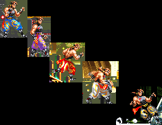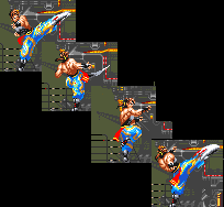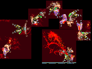 | レバー上下前方向Aボタン(連打): 麒麟刻み舞い(パンチ3発のコンビネーション)。出しやすいやり方としては上下と前方向にレバーを振りAボタンを連打。これでかなり出しやすくなりますが、前身しながらになりますので、接触判定を持つ敵相手にはやらない方がよいです。通常攻撃よりも、パンチが高い攻撃力を有しているので、耐久値の高い敵を相手にする場合は適当にレバーを上下に振るだけで効果があります。また、前方向への入力がないと、最後のストレートは出ません。 |
