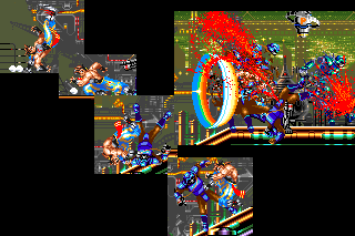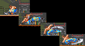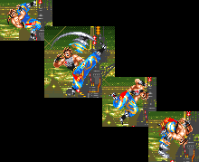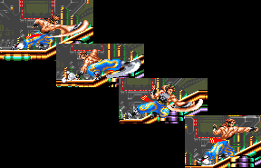 スライディング中にBボタン: 投げ技(地獄車)が発生。敵を掴み、回転した後レバーを入力した方向に放り投げます(ニュートラル及び下の場合は進行方向)。投げ飛ばされた敵は他の敵を巻き込んでダメージを与えます(ただし、上方向に投げた場合は敵をまきこみません)。スライディング方向以外にも投げ飛ばすことが出来ますので、その場の判断で敵が多い方向や、敵をまとめたい方向に投げ飛ばすとよいです。 |