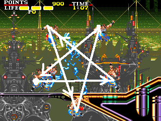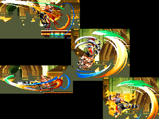 | Cボタン(海外版は前方向2回+Aボタン): 麒麟星祭りが発動。空中地上場所を問わずで発生する最強攻撃です。発動させるとかけ声と共に前方に攻撃、矢継ぎ早に逆斜め上方向、下、斜め上方向、そして起点と、丁度星のかたち(上下逆)をなぞるように空を舞い、最後に設置された全ての逆サイドに抜けるように5つの分身が空を駆けて画面全体に星を刻む大殺陣です。 発動した瞬間から完全無敵で体力の高い敵にも大きなダメージを与えることが可能です。なお、計6回の連撃を完璧に命中させるには、1発目の打撃を命中させなければなりません(いずれかの回数めの攻撃を命中させると、そこからは全てヒットします。また、全く命中しなくても5、6発目は必ず命中します)。最初の横一発を当てれば大ダメージ確定なので、ボス相手に決め撃ちするときは適当にぶっ放すのではなく、敵の位置を確認してから打ち抜くようにしましょう。 ただし、体力がなくて一発逆転や回避を狙うのであれば、死ぬよりも星祭りを使った方がイイ(死亡したら3個のストックが復活するので、使い切って死んだ方がいい)ので、そういう場合は躊躇わずに放ちましょう。 ちなみに、星祭りのストックが補充される機会は一切無く、プレイヤー一機あたり3つ、通常設定ではプレイヤーキャラの人数はエクステンド含めて3人しかいないので、実質9発しか放てません。また、国内版でも一部のロケテストバージョンでは前方向2回+Aボタンで星祭りが発動したそうです。 |