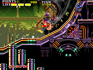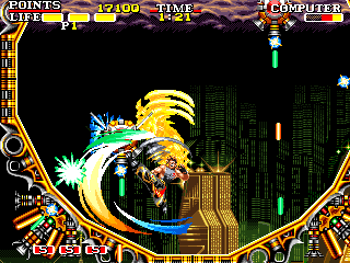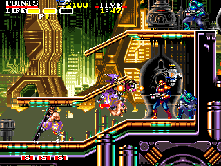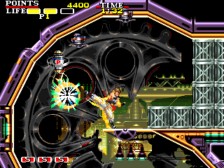 Aポイント:ビーム砲台は全て投げよう 通常打撃を入れようとすると、結構な確率でバリアを展開し、プレイヤーが近所に寄っても容赦なくレーザーを撃ってくるビーム砲台。適当にプレイしていると思わぬダメージを喰らいかねない敵で、スタート時はライフが3つしかないので、ちょっとしたダメージが命取りになりかねません。 そこでビーム砲台が出てきたら、まずはしゃがんで様子を見て、レーザーの合間にスライディングで近付き、ぶん投げてやりましょう。丁度周りにはザコ兵士も多数存在しているシチュエーションが多いので、一緒に巻き込めるので一石二鳥です。 中段の写真の場所にはビーム砲台が真ん中の段にもう1機設置されていますが、そいつもレーザー照射の合間にジャンプで接近して、接触したところを空中投げで仕留めましょう。 |