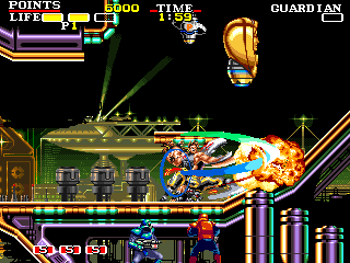 Cポイント:ガーディアンは刻み舞いで 小型砲台地帯を抜け、積み上げられているコンテナを破壊すると、ガーディアンが3機設置されています。こいつらも放置するとビームと回転する弾、そして体当たりという攻撃をしてきますので、なるべく早く撃破するようにしましょう。 刻み舞いは最後まで出す必要はなく、レバーを軽く上下に降ってパンチを出すようにすればいいです。 ガーディアン破壊後も時折回転弾が残っているときがあるので、その時は落ち着いてジャンプやしゃがみでかわしましょう。 |