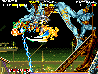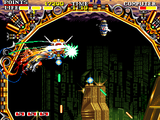 | Dポイント:マテリアル戦 ポイントに到着するとせりあがってくるマテリアルとの戦闘になります。左端で左右に動く電撃は近寄らなければ問題ないですし、時折飛んでくる光弾、蝶弾はそれほど激しい攻撃でもないので、かわすのも破壊するのも容易だと思います。 ここはパワーアップ時の分身を攻撃ボタンを押すことで置きたい場所にキッチリと配置する練習をするとよいでしょう(マテリアルの急所である頭部や、光弾が飛んでくる位置など)。 |
