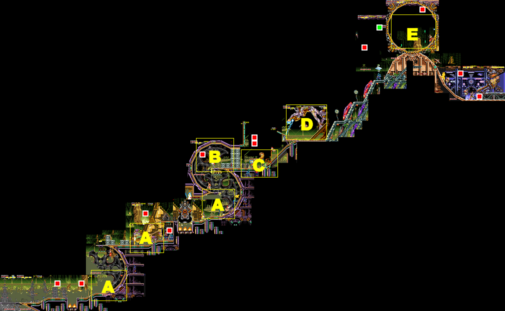 Eポイント:コンピュータ戦 マテリアル戦を抜け、道中の半重力石の特性を確かめつつ回復アイテムなどを回収後は、ボス前最後の門番、コンピュータが待ちかまえています。 左右に登場したコンピュータは左にゆっくりと回転しながら一定方向(左のモノは下と左下、右のモノは下と右下)に向けてビームを発射します。左側にいるモノが、いい具合に下方に降りてきますので、そこをジャンプ攻撃で即撃破、次いで画面の左端の側壁に掴まって右側から移動してきた残りのコンピュータを撃破しましょう。 ここはモタモタしない限りはまずダメージを喰らうような場所ではないと思います。慣れていないと意外と手強いボス戦が控えていますので、無駄なダメージを喰らわないように注意して下さい。 |