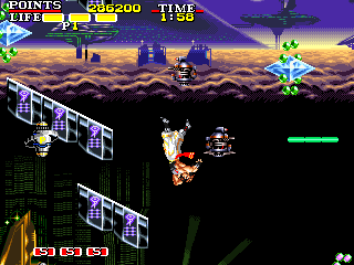 VISETE 点数:計2000点 投げ:不可 1面にいた障害物キャラに足が生えたもので、中ボスとしてプレイヤーに向かってきます。 攻撃方法は円を描くエネルギー弾と接触、小型の機械を複数吐き出すというもの。下半身を破壊することでジャンプからの踏みつけ攻撃が追加されます。 下半身を即破壊して、上半身は数回キザミ舞いを決めることで簡単に倒すことができます。長期戦になるとリスクが高いので、速攻撃破をこころがけましょう。なお、下半身、上半身各1000ptsです。 |