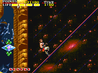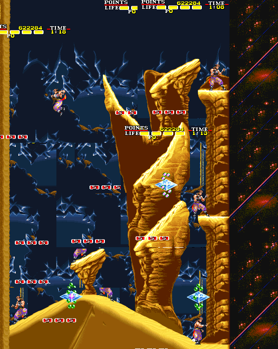 | Aポイント:どの狄から戦うのか? このエリアの終端部分は、上、中、下の3つに枝分かれしており、次のエリアの2つの終端を含めて、どのルートを選ぶかによって、これから先に戦う「狄」の順番を決めることができます。以下にルート毎の登場順番を記しておきます。 上、上:カノンス>ティアノン>ウィルフ 上、下:カノンス>ウィルフ>ティアノン 中、上:ウィルフ>カノンス>ティアノン 中、下:ウィルフ>ティアノン>カノンス 下、上:ティアノン>ウィルフ>カノンス 下、下:ティアノン>カノンス>ウィルフ オススメのルートは、「下、上」のルートです。理由としては、3人の「狄」のなかでパターンが作り辛く、安定しないのはティアノンとウィルフで、カノンスは攻撃の回避パターンが比較的作りやすく、攻略が安定しているからです。 最後の「狄」として選んだキャラは道中屈指の難易度を誇る「記憶の森」を抜けた直後に戦わなければなりません。安全な道中パターンを構築したとしても「記憶の森」のプレイは安定せず、無傷で戦闘を行える可能性がとにかく低いのです。 故に「記憶の森」走破後に戦う相手は、比較的戦いやすいと思われるカノンスを選択するのがベスト、ということです。 また、ティアノンを最初に選んだ理由としては、3面の最終エリアである回転フィールドで対峙するのに最も適しているからです。 他の狄相手では邪魔になる回転フィールドの特性が、ティアノン戦では近接投げ攻撃を回避したり、素早く立ち回り位置を移動したりするのに使えるなど、比較的優位に進めやすいのもポイントのひとつです。 以上の理由から、ゲームに慣れるまでは(もしくはプレイを安定させたければ)上記のオススメルートを使用することを推奨します。 |