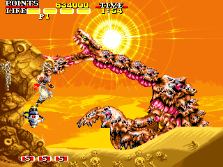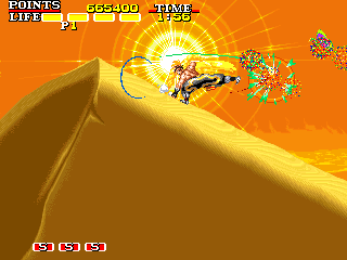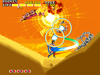 ワーム(写真上) 点数:300pts 投げ:不可 一定の地点から突然飛び出し、放物線を描きながら襲いかかってくる怪物です。プレイヤーを追尾する能力などはないので、出現位置を覚えて分身を設置して対処しましょう。勿論、プレイヤー自身で蹴散らしても特に問題はありません(やや危険ですが)。 サソリ(写真下) 点数:20pts 投げ:可 ゆっくりとフィールドを徘徊しているだけなので、適当に処理しても問題ありません。余裕があれば投げを狙っても面白いかもしれませんが、一応接触時に攻撃されることもあるので、最初のうちは体術と分身で手堅く殺害しましょう。 |