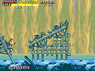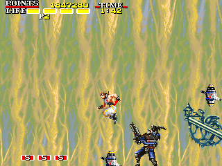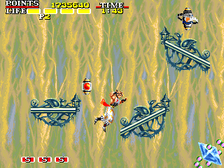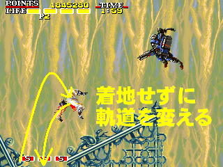 空中兵士をやりすごした後は、再びDポイント最初の位置(Cポイントの最後の位置)に戻り、すぐさま右上に見える段に向けてジャンプ、床に引っかけます(右側写真6)。 そこから上段に昇る(レバー上+Bボタン)と、画面右上から左に向けて空中兵士が現れるので、反撃を受ける前に跳び蹴りで叩き伏せましょう(右側写真7)。こいつは逃げ切るよりも、迎撃する方が安全です。 ここまでの敵を撃破(もしくはやりすごした)したら、Dポイントの右下あたりに存在している半重力石に乗って、次のポイント(Eポイント)へと向かいましょう(半重力石に飛び込んだら、レバーを右に入れ続けることで、Eポイントの左端にある半重力石付近まで飛んでいけます)。 |