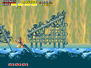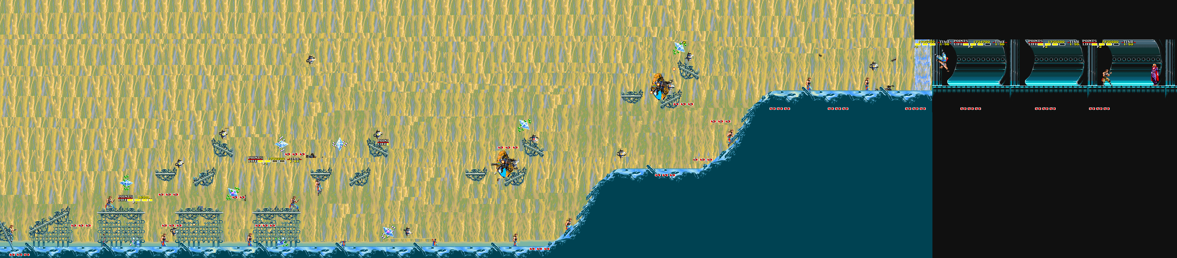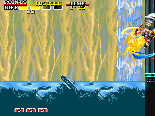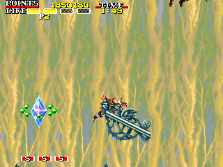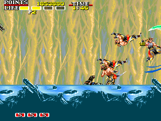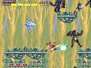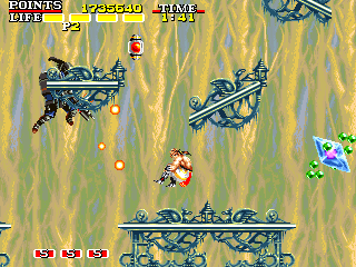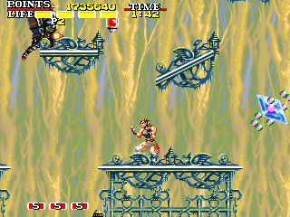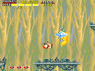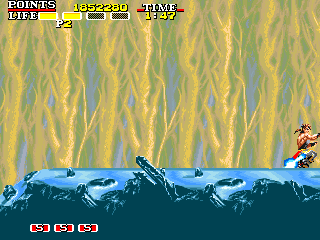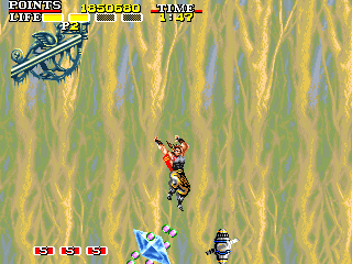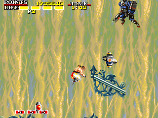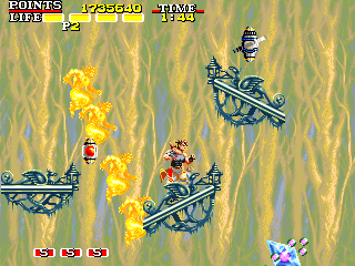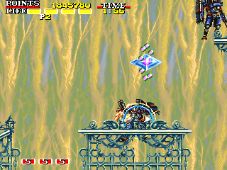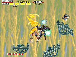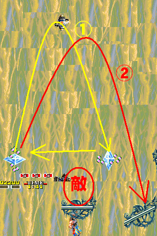 次にそのまま右へと進むと、左右に移動しているだけの空中兵士が上下に2体並んでいますので、軽く撃破しておきましょう(右側写真3、4、5)。 また、Bポイント下方にある赤アイテム付近は、敵が出現することのない安全圏なので、パワーアップが足りていない時は取りに行くとよいでしょう。 *追記 時折下方に虎が出現することがあります。完璧に安全ということではありませんので、赤アイテムを取りに行く際、無駄なダメージを受けないよう注意しましょう。 |