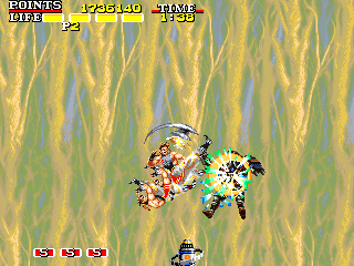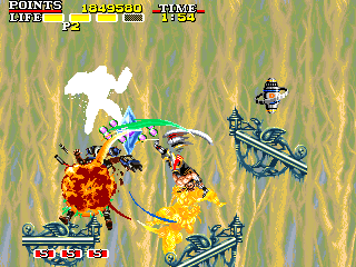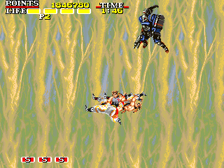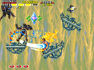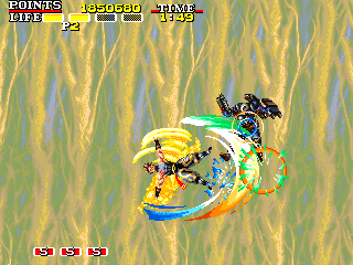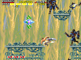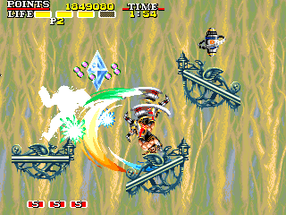 | 次に右に向けてジャンプしながら攻撃ボタンを連打。すると丁度プレイヤーが降り立った場所から空中兵士が出現しますが、配置された分身の攻撃でそのまま撃破できます(右側写真2)。 | ![]() |