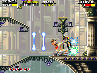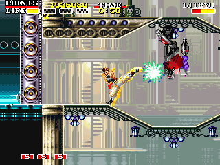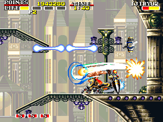 2体め(IJIRYU2)は左右から交差するエネルギーフィールドを避けて本体を攻撃(レバーを上下に振っておくと、威力の高いパンチ攻撃が出て素早く倒せます。前進して刻み舞いを成立させると接触ダメージを受ける危険があるので注意)して撃破。 |