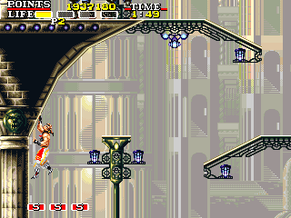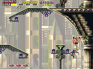 これで先程のBポイントと同じような位置に移動できたので(右側写真5)、あとは同様の攻撃パターンでT-TANKと機雷を破壊して下さい。 ちなみに、このポイントは、もう一つ下段T-TANKの攻撃を抜ける方法があります。それは、右側写真1の位置から、左側に向かってジャンプするというやり方です。スクロールのタイミングと、絶妙な位置合わせで、瞬間的にT-TANKの弾幕をくぐり抜けて、右側写真5の位置に掴まる……というモノですが、前述の方法と比べると時間はかからないというメリットはあるものの、かなり危険度は高いです。 最初の内は、タイミングを覚えるのが面倒かもしれませんが、誘って避ける方法の方が安全なので、無理に後述の方法を使う必要はないと思います。 上段のT-TANKまで破壊した後は、さらに上へと進む前に、Eポイントへと寄り道しましょう。 |