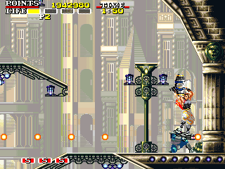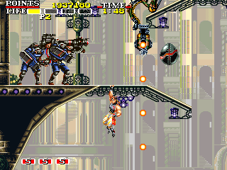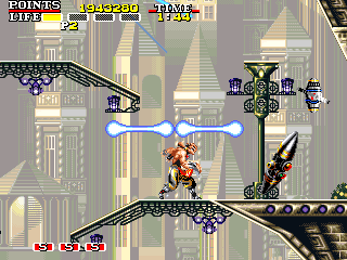 | まずは上段に移り、間髪入れずに左側に攻撃。砲台兵士を瞬殺します(右側写真3)。砲台兵士を殺すのに戸惑っていると、奴らはしゃがみやジャンプで回避ができない電磁砲を発射してきます。このシチュエーションでそんな弾が飛んできたら確定でダメージを受けますので、殺られる前に殺りましょう。 | ![]() |