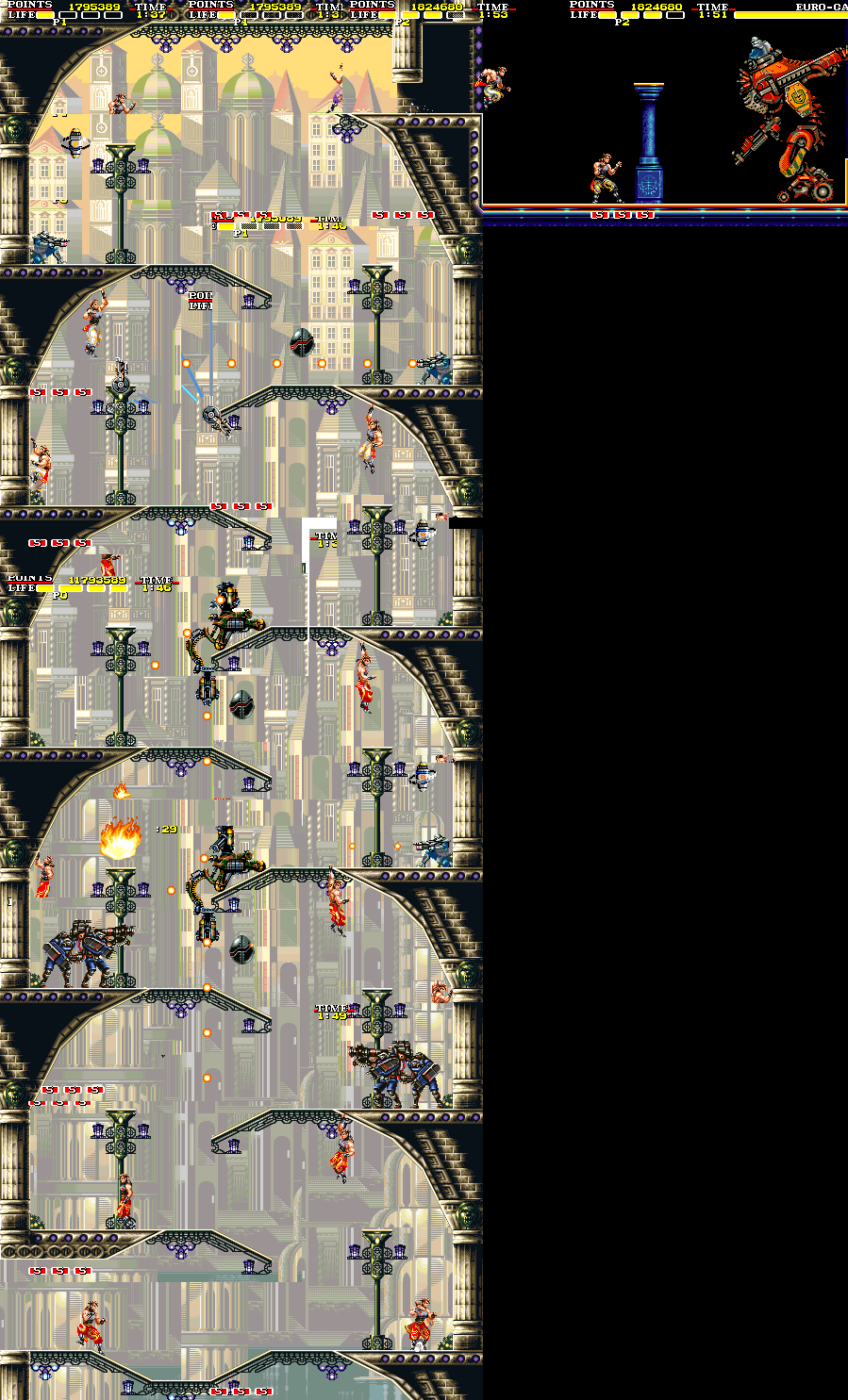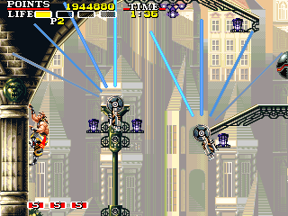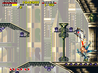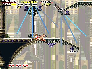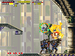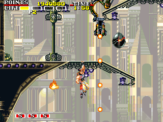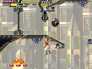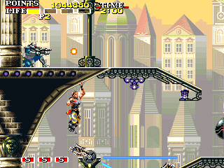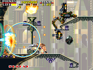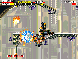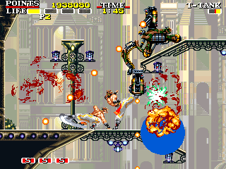 | 左側の壁をつたい、右側写真2の場所に到着すると、丁度画面を分割するいきおいでT-TANKの下段砲台が下方に向けてマシンガンを乱射しています。このまま上段に降り立ち画面上にいる敵を全て粉砕するのですが、安全に倒すのには順番があります。まずは左側に立つ砲台兵士、次に下段T-TANKと機雷、最後に上段にいるT-TANKです。 | ![]() |