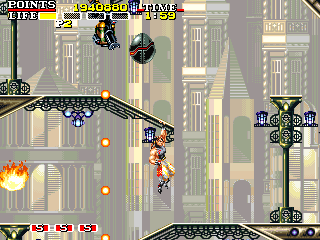 Eポイント:横からダメなら空から叩け! このポイントにいるザコ兵士は、他の方向に注視せず、ただひたすら休むことなく横方向に向けてマシンガンを乱射しています。別にプレイヤーの接近に合わせて射角を変えたりはしてこないので、Cポイントの砲台兵士と同じく、上空からの奇襲が有効となります。 ただし、砲台兵士と違って投げが有効となっていますので、左側写真のように上から忍び寄ります(左側写真1)。 |