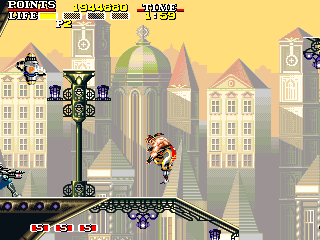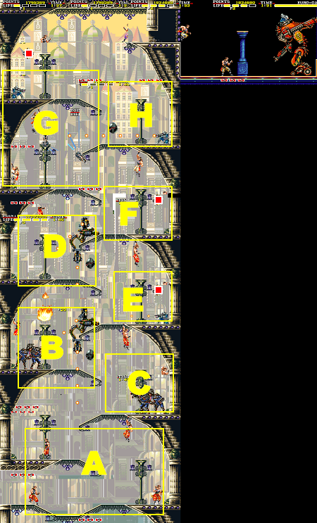 彼らが発砲した直後を見計らって、上空から飛来し、そのまま跳び蹴りを叩き込んでトドメをさしてください。なお、彼らには投げ技が一切成立しませんので、ここでBボタンを連打していても空中投げ等は成立しません。華麗な跳び蹴りで地獄に送ってやりましょう。 次はDポイントに向かいます。BポイントでT-TANKの上段砲台が設置されていたあたりまで移動して下さい。 |