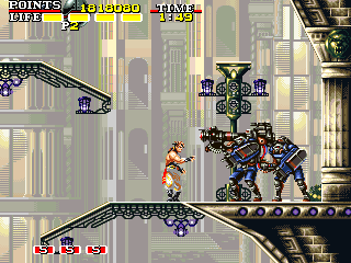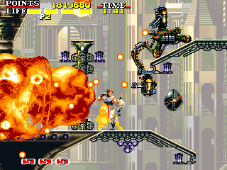 | ザコ兵士 点数:100pts 投げ:可 今までの俺たちとはひと味違うぜ! と言わんばかりにマシンガンを猛乱射しているザコ兵士。横方向への射撃はある意味完璧ですが、画面外からスライディングで突進後投げや、画面外から横ジャンプで飛び込み後の蹴り一発でKOされちゃうやっぱりタダのザコ兵士でした。 |