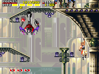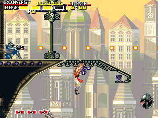 飛行兵士 点数:500pts 投げ:可 前面に引き続き、記憶の森でも猛威をふるう恐るべきザコキャラ。前述しましたが、このステージの生死をわけるのはこのキャラの対処によってほぼ決まると言っても過言ではありません。常に動きを把握し、一歩前を行く行動を目指して下さい。 |