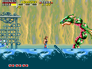 ミズチ 点数:2000pts 投げ:不可 攻撃方法は身体を伸ばした突っ込みのみという単純なキャラに見えるのですが、意外とリーチがあり、かつコイツと対峙するフィールドが常に水流が一定方向に流れているという非情に戦い辛い場所な為、なかなかの強敵になりえるキャラです。これまた安全圏を突き進むルートを進行した場合、一度も戦うことはないので、記憶の森をくぐり抜けるコツとしては、コイツと一度も鉢合わせしないコトが重要となります。 もし、戦うハメになった時は、3面開幕のサンドラと同様に分身を設置して安全圏に逃亡、あとは分身の攻撃にまかせましょう。 |