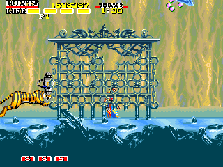 | 虎 点数:100pts 投げ:可 2面に登場したモノと仕様は変わりありません。安全ルートを通ればコイツと戦う場面は全く無いので、当ページの攻略で登場することはありません。一応スコア狙いなどを考えていくと彼らの対処も重要になってくるのかもしれませんね。 |