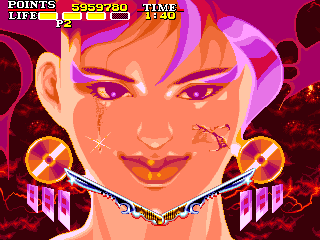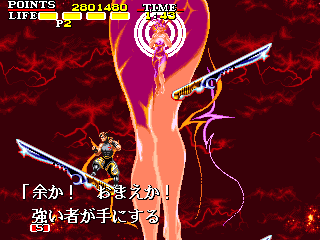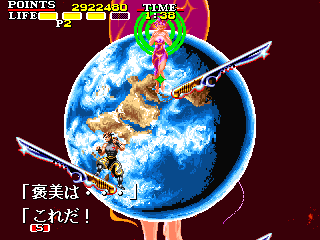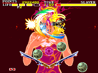 スレイヴァー 点数:500000pts 投げ:可 あらゆる艱難辛苦を乗り越えて、遂に麒麟は神の元へと辿り着いた。 強き者が手にする最後の褒美──地球。神を殺して自ら神と成すか、それとも神の威光に砕け散ってしまうのか、最強の戦士、狄・麒麟最後の戦いが幕を開ける! このゲームの最終ボスにして、自ら神を名乗る存在。攻撃方法は体当たりとエネルギー弾、そして周囲を飛び回る隕石(ダメージを受けたら地球を模したモノに変化)、螺旋状に画面を包む8つの弾と、飛び道具やいやらしい攻撃が満載です。 |