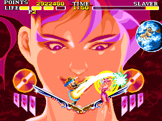 | 最終段階はそれほど強くないが油断するな!: 第2段階から更にダメージを与えると、背景が更に巨大化して最終段階に突入します。 最終段階は飛び交う隕石が地球を模したモノに変わるだけで、あとは第2段階で厄介な存在であった螺旋弾も撃ってきません。 スレイヴァー本体の攻撃であるエネルギーフィールドとエネルギー弾に気を付けながら、最後まで油断せずに攻撃を続けて下さい。もう勝利は目の前です。 ちなみに、ここで残機を残したまま死亡すると、スレイヴァー戦開幕からリトライすることになりますが、麒麟星祭りを3発、ほぼ完璧にヒットさせればそれだけでスレイヴァーを叩き殺すことも可能です。 一応、残機に余裕が有れば……という話ですが、それにしてもあまりにも面白くないので、できればガチンコファイトで神殺しを実現してみせて下さい。 |