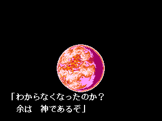 神と成った男── スレイヴァーの断末魔が響き渡り、虚空に浮かんだ神体は醜く歪み、涙を流す。 スレイヴァーの涙は地球へと落ち、地球は再び青の色を取り戻す。 「わからなくなったのか? 余は 神であるぞ」 最後まで神であることを捨て切れぬスレイヴァー。そして──。 「余が 神であるぞ」 響き渡った最後の言葉は、神を砕き愉悦にひたった狄・麒麟の口から放たれたのか、それとも己が奪われた立場にいまだ未練を残す、古き神の戯れ言なのか──。 |