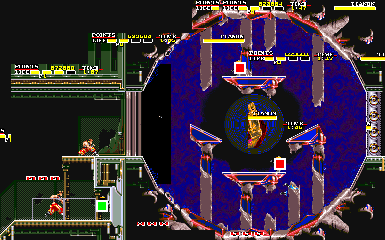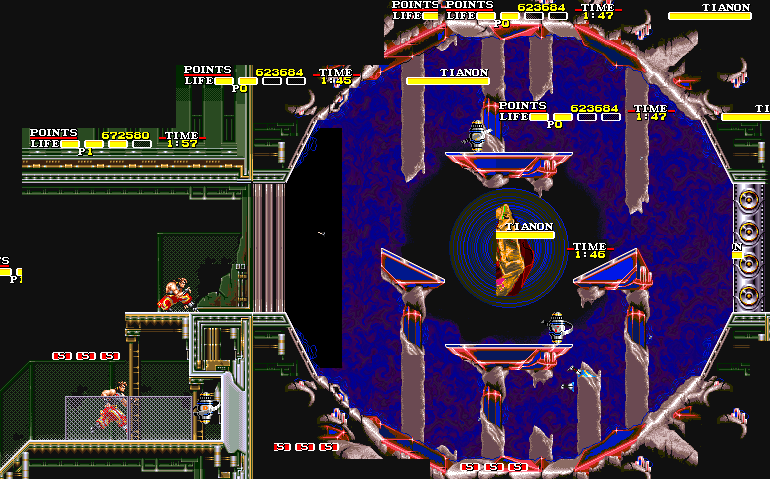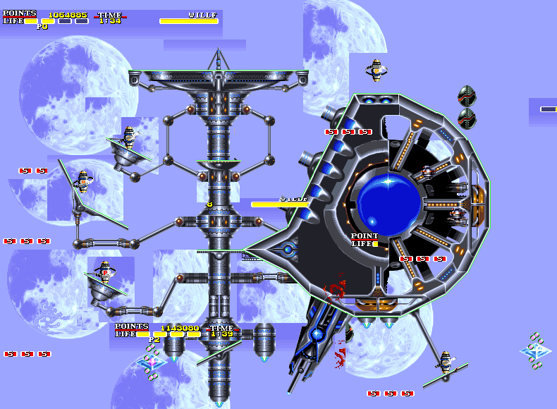 アイテム数:赤2、緑1 オススメキャラ:ティアノン ステージ3の終点、もしくはステージ5で選択することで戦える戦闘場。体力回復があるものの、戦いが始まってから入手できるのはパワーアップが2つのみで、バトル中の回復手段はありません。 円状のフィールドの外周部分が常に回転作用(右回転)のある力場で形成されており、対戦するキャラによっては移動が制限されることもあります。ウィルフ、カノンス相手の場合は力場の働いていない中央付近に陣取って戦った方が安全です。 |