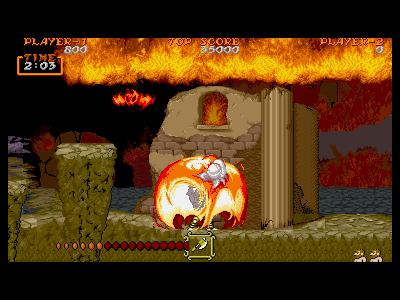 爆炎の魔法。プレイヤーの周辺に、爆発を起こす。爆発は、計2回発生し、そのどちらにも独立したダメージ判定があります。攻撃力はそこそこ高いのですが、耐久力のある敵に対して使用した時、その一撃でトドメをさせなかった場合、爆発が終わった直後の隙で、そのままダメージを受けることが多く、使いやすいとは、お世辞にも言えません。 武器、魔法共に良いところがあまり無い武器なので、無理に使う必要はないでしょう、間違えて取った場合は、直ぐに他の武器と交換することを考えて行動して下さい。 |