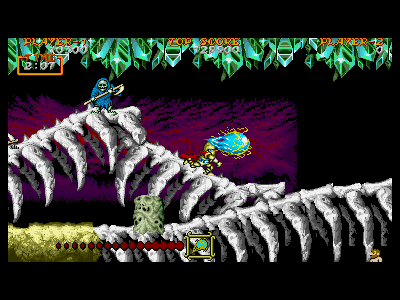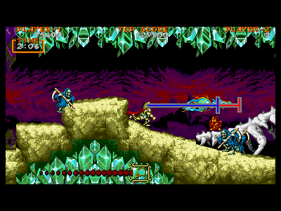 | 2週目から入手可能になる、最終ボスを倒すために必要かつ最強の武器です。入手方法は、黄金の鎧を装備した状態で、2、3、4個目の宝箱を開ける事で出現する、戦いの女神が武器に変わるまで待ち、それを入手すればOK。 威力は通常の武器よりも高く(距離によって増減します。最大は3倍で、消滅する直前は通常武器と同様になります)、背景以外の物体を全て貫通する(耐久力のあるキャラクターも含む)という特性を持っています。リーチは若干短めですが、その威力、攻撃判定の広さを考えれば、あまり問題になりません。 とくに攻撃判定の広さは凄まじく、自分が宝箱の上に乗っているときに、しゃがんで投げると、その攻撃で自分の下にある宝箱を破壊してしまうほどです。 |