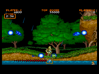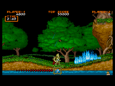 | 攻撃ボタンを押すと、火球が弧を描いて飛び、地面に着弾すると、前方に火柱を立てます。火柱は広範囲に攻撃判定を持っているのですが、燃え続けている間、個体の敵に連続したダメージを与えることはできず、一つの火柱で与えられるダメージは、他の武器と大差ありません。 雑魚敵を相手にするときの「壁」として利用できなくもないのですが、致命的なのはそのリーチの無さと、着弾しなければ、ただの弧を描く小さな火の玉でしかないということです。 上下段に分かれている地形などで、上段の端から火柱を発生させると、そのまま火柱が下段に落ち、変則的な攻撃をすることも出来ますが、あまり実戦では役に立ちません。余程、自分の腕に自信が無い限り、取ることはオススメしかねる武器です。 |