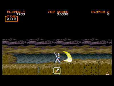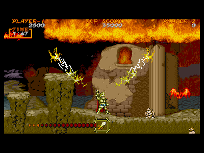 雷龍の魔法。両斜め上方向に雷龍を打ち出して、そのままプレイヤーの元に戻ってくるという攻撃。判定も大きく、最後にプレイヤーに向かって飛んでくるので、ぎりぎりまでプレイヤーの安全を守ってくれる、そこそこ使いやすい魔法です。 これで剣が武器としてそれなりに使えるものならば、もう少し使いようがあったとは思うのですが・・・。 逆に、剣を間違えて取ってしまった場合の切り札的存在とも言えます。他の武器に交換するまでに、活用すると良いでしょう。 |