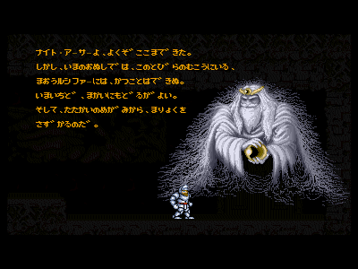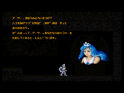 | こうして、5面を無事クリアすると、1周目クリアということで、1周目エンディングに入ります。まずは、大天使ミカエルからのお褒めの言葉と、2周目のヒントを教えてもらいます。 戦いの女神から授かる魔力というのが、サイコキャノンのことです。 次に、オープニングデモで殺されたプリンセスからのヒント。このデモが終了したら、そのまま2周目の1面からスタートします。 |
