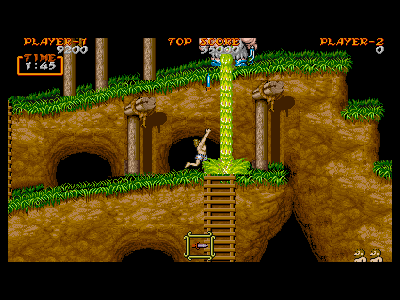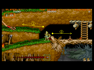 | C地点:どちらに行く? ここで、ルートが二つに分かれます。左側にジャンプして進んでいくルート1と、右に進んでいくルート2です。ルート1は、はしごという、無防備状態(上っている最中は何も出来ない)になるものを極力避けて進むことができますが、豚男を同ライン上で相手にしなければいけないというデメリットがあり、ルート2は、はしごを複数上る危険を冒しますが、豚男を常に真下から相手にできます。 最初は、豚男の対処が大変だと思うので、ルート2を進めばいいでしょう。豚男の攻略に慣れたら、ルート1の方が楽だと思います。ちなみに武器がナパーム&剣の場合、有無を言わさずルート2を選択しましょう。 ちなみに、ルート1の宝箱を出した後、ルート2に向かう(当然、逆も可能)こともできます。嵐の中の、1つ目の宝箱を出すのが苦手な人は、試してみるといいと思います。 |