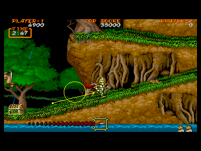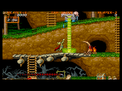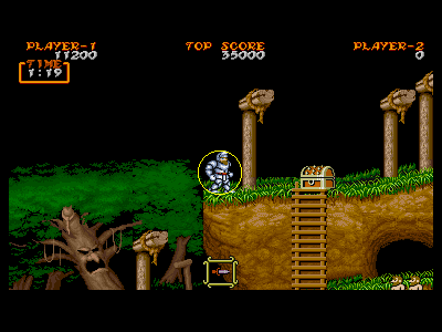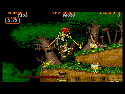 1面の後半部分は、全部合わせて宝箱が5つ、出現します。それぞれ分散された場所に出るので、どの宝箱を、何番目に出したか、きちんと把握するようにしましょう。特に、4つ目の宝箱というのは、パンツ状態の時の復活、金の鎧の出現など、重要な要素なので、自分が苦手な地点を越えた所に出現させるように調整しましょう。これは、後の面にも共通して言える部分なので、常に心がけておけば、ミスを極力減らすことができると思います。