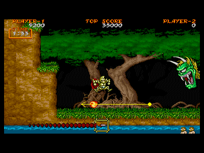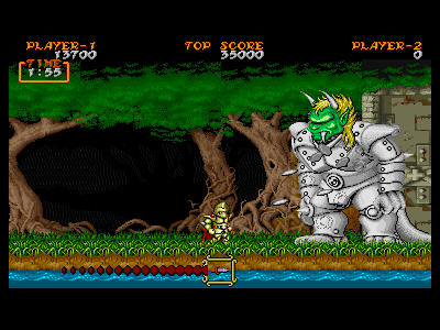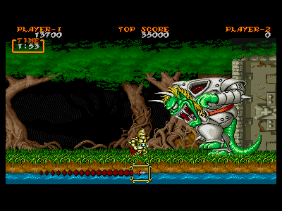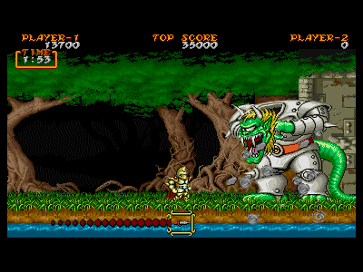 ・とにかく、先手必勝! まず、シールダーの弱点である、首を画面端に捉えるくらいまで下がり、出現デモが終わったのを見計らって、ジャンプ攻撃をしかけます。とにかく、このボスは、長期戦になればなるほど苦しい戦いになります。 運が悪ければ、あっという間に画面端まで追いつめられます。そうなる前に、どれだけダメージを与えられるかが、勝負です。 |