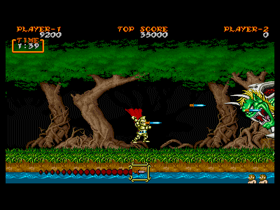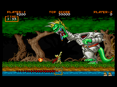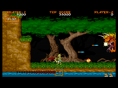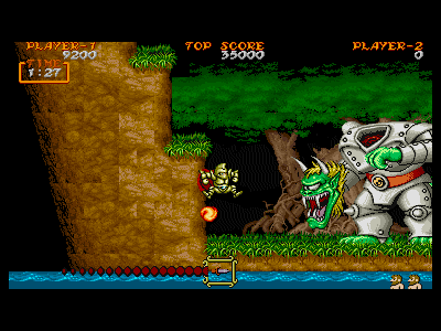 | ステージ1ボス:シールダー 弱点:頭部 耐久度:22発 攻撃方法:右腕に付けた頭部から、火の玉を吐き出す。火の玉は、プレイヤーを狙って吐き出される。 点数:クリアボーナス5,000点 |