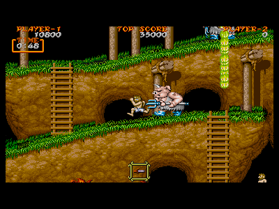 豚男:生息地 1、5面(500点) 1面道中内最大の難敵。同じフロアにいるとき(X軸が合っている時)には、正確無比なボディプレスと、素早い突進で襲いかかり、真下に相手を捉えたとき(Y軸が合っている時)には、強酸性の吐瀉物を吐き、攻撃してきます。 耐久度は5発と高く、武器(剣、ナパーム)によっては、横から近づいた場合、まず一撃は覚悟しなければいけません。他の武器でも慣れるまでは、横から近づくのは危険です。吐瀉物を吐いている時が、完全に隙になっているので、その時に下から攻撃するのが、ベストの攻撃方法です。とにかく、同じ段に立たないように注意しましょう。 |