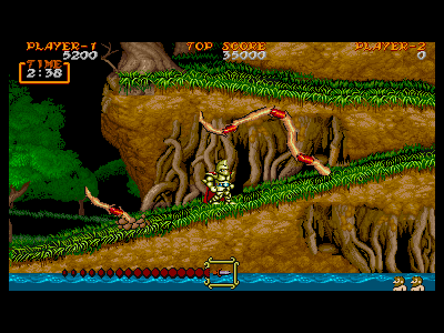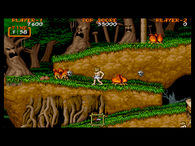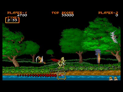 | カマイタチ:生息地 1面(200点) 1面後半に入ってすぐの、嵐の中を突き進んでくる敵。回転しながら飛んでいるときは完全無敵で、どんな攻撃も通用しません。回転をやめ、姿を現した(写真左端の状態)時のみ、攻撃を受け付けます。 耐久度も低く、大したことのない敵ですが、嵐という地形条件が、プレイヤーを阻み、一見このなんでもない敵を、いやらしい「壁」にしたてあげています。嵐の影響が強いときは、無闇にジャンプして避けるのはやめた方が無難でしょう。 |
