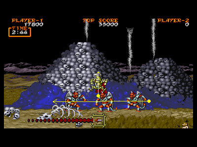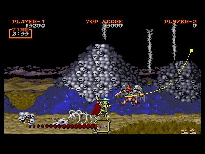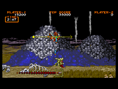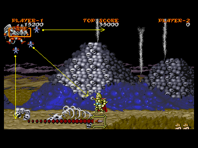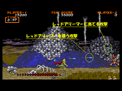 | パターン1:レッドアリーマーがプレイヤーの真横にいる場合 まず、垂直ジャンプをし、その頂点付近で、一発武器を投げます。この攻撃をレッドアリーマーに当てます。次に、着地直後、プレイヤーの横にいるレッドアリーマーに向かって、武器を投げます。 レッドアリーマーは、自分に向かって飛んでくる武器を、垂直に飛んで避ける習性をもっており、着地後にプレイヤーが投げた武器(レッドアリーマーに向かってくる武器)に反応して、垂直に飛んでかわそうとします。垂直ジャンプしたレッドアリーマーに、最初にジャンプして投げた武器が命中します。これは、レッドアリーマーの武器を避ける習性を利用した、もっとも初歩的なダメージを与える手段です。まずは、これを確実に命中させるように練習しましょう。 2発目(レッドアリーマーを誘う攻撃)を投げるタイミングは武器によって若干異なります。ナイフ等の、速度の速い武器は早めに、槍等の遅い武器は、遅めのタイミングになります。 |