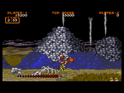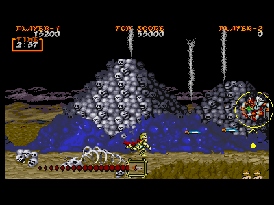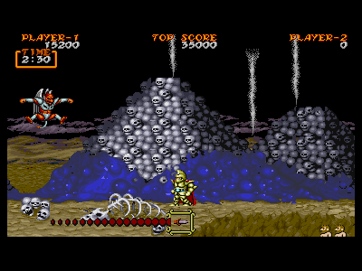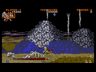 パターン2:レッドアリーマーが、斜め上から体当たりしてきた場合 斜め上からの体当たりは、2種類存在し、1つはかなり下に深い位置まで飛び込んでくるもの。これはしゃがまないと避けられません。もう1つは、あまり深い位置まで飛び込んでこないもの。これは、しゃがまなくてもギリギリ避けられます。2種類の体当たりの兆候は、ある程度慣れ(突っ込みのスピード、深さを瞬時に判断出来たら)たら見分けることが出来ますが、慣れないうちは、まず見切れないので、どちらもしゃがんで避けた方が賢いと思います。 このパターンは、この斜め上からの体当たりを避け、なおかつダメージを与えるという、いわばヒットアンドアウェイとよべる方法です。ちなみに、ダメージを与えられるのは、レッドアリーマーが深い位置まで飛び込んでくる場合のみに限られます。 方法は、レッドアリーマーが、プレイヤーに向かって突っ込んできた所に、武器を一発投げます。左上図ぐらいのタイミング(レッドアリーマーが接触する寸前)がベストです。次に、武器を投げた後は、速攻でしゃがみます。突進中は攻撃を避ける術を持たないレッドアリーマーは、攻撃を喰らって、逆方向の斜め上まで飛んでいきます。このときに、浅い角度の体当たりの場合、ダメージを受けないまま、逆サイドまで飛んでいきます。この攻撃パターンを何回か試している内に、自然と体当たりの種別も区別が付くようになると思います。 |