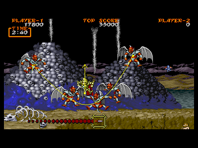 | パターン1:レッドアリーマーがプレイヤーの斜め上にいる場合1 プレイヤーの斜め上でホバリングをしている時、こいつの行う最も多い行動は、そのままプレイヤーに向かって突っ込み、放物線を描きながら、逆サイドに移動する、というもの。 この攻撃は、しゃがんでいれば簡単に避けることができます。この、しゃがむという動作は、レッドアリーマーの攻撃を避けるのには、重要な要素となっており、他の攻撃も、しゃがんでいると、なぜか避けることができたりもします。他の避け方については、連記していきます。 ちなみに、この突っ込みの後、逆サイドに上昇せずに途中で止まり、再度、突っ込みを仕掛けてくるパターンも存在していますが、それもしゃがんでいれば、避けることができます。 回避行動に慣れてきたら、攻撃編で説明しているパターン2に相当する攻撃法が通用するので、武器を投げておく癖を付けるようにしましょう。 |