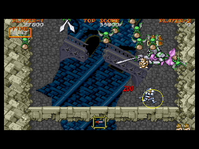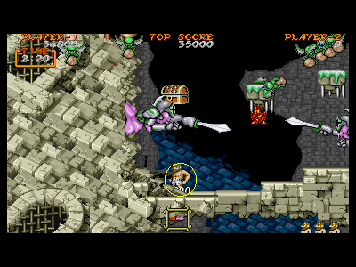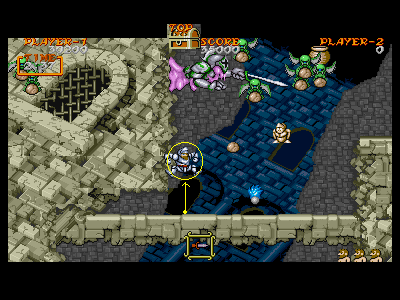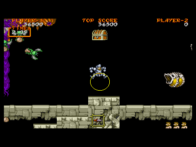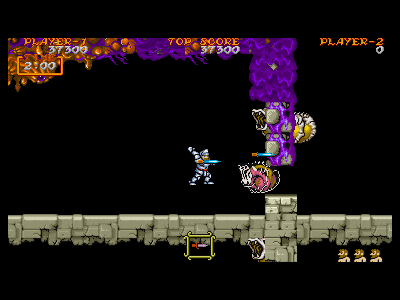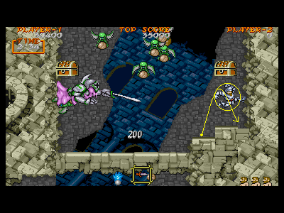 B地点:2、3つめの宝箱 横にスクロールが出来るようになった直後の、左端の壁に沿って垂直ジャンプすると、2つめの宝箱が出現します。その後、真上の鎧泥男を倒し、直ぐに右へと走っていきます。 今度は、右端の段でジャンプすると、3つめの宝箱が出現します。強制スクロールしているため、二つの宝箱を出すのはスピード勝負になります。また、横に強引に突っ切るため、フライングゴブリンの餌食になりやすいです。注意しましょう。 |
