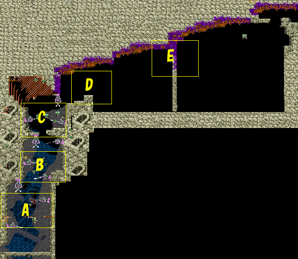 | E地点:破壊できる壁 この周辺で大量発生しているビホルダーに、邪魔されながら前進すると、この壁に突き当たります。プレイヤーが通る事が出来るほぼギリギリの幅だけ破壊できる壁になっており、ここからしか先に進むことができません。ここを抜けなければ絶対に死んでしまうので、ここまでは出来るだけ急いで来るようにしましょう。この壁を抜けたら、後はそれほど苦労せずに、前半はクリアできるでしょう。 ちなみに、5つめの宝箱の中身を取った場合、ここを抜けるのが非常に困難になります。 |