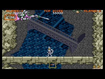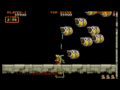 | フライングゴブリン:生息地 3、5面(100点) 画面の上方から現れ、トリッキーな動きでプレイヤーに突進を仕掛けてきたり、その両足で挟んでいる石を落として攻撃してきます。 一匹一匹は大したことはないのですが、集団で攻めてきたときの嫌らしさは相当なものです。さらに、他の敵に気を取られている間等に降ってくる石が避けられないなどもしばしば見られます。 障害になりそう(自分の上に居る状態)な時は、優先的に倒すようにしましょう。耐久度は、一発です。 |