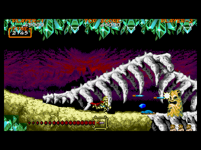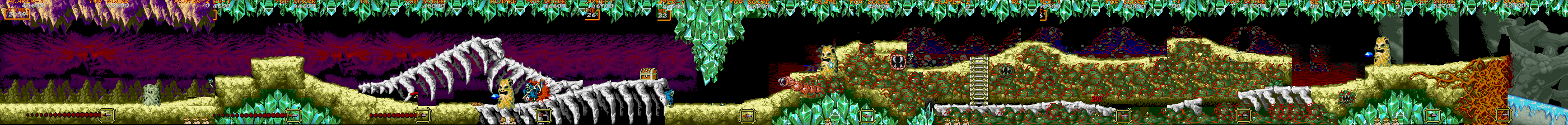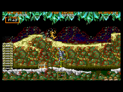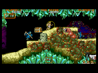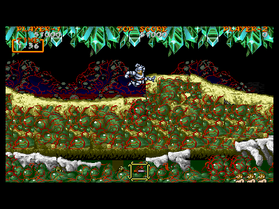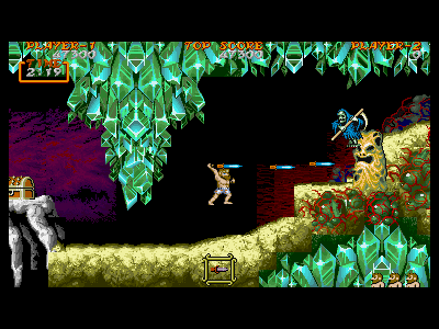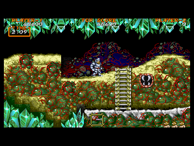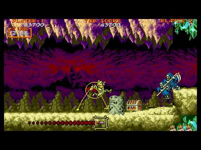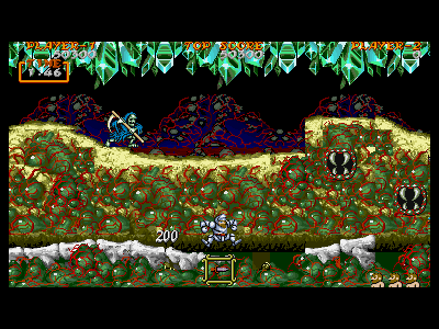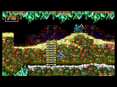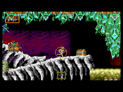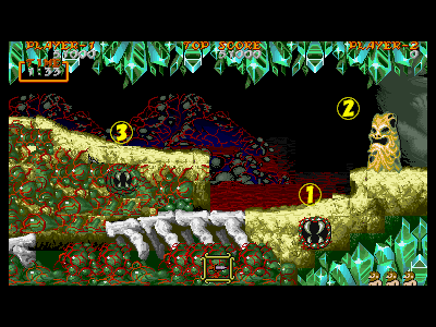 B地点:2つめの宝箱と、最初のデスタワー 左図で示してある位置を通過すると、2つめの宝箱が出現します。上にぶら下がっているクリスタルの固まりは、攻撃判定を持っているため、宝箱を破壊し、中身を回収しなければ、上段を通過することはできません。金の鎧を装備している場合、これはあまりいい方法とは言えません。 そこで、下段にいるデスタワーを破壊して進むのがベストの方法になるのですが、この辺りは、上段、下段から、絶え間なく死神が出現するため、デスタワーの出す弾にばかり集中していると痛い目にあいます。 慌てずに落ち着いて対処しましょう。ちなみに、左図の辺りから攻撃したら、デスタワーの弱点に当たりやすいです。 |