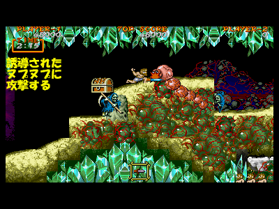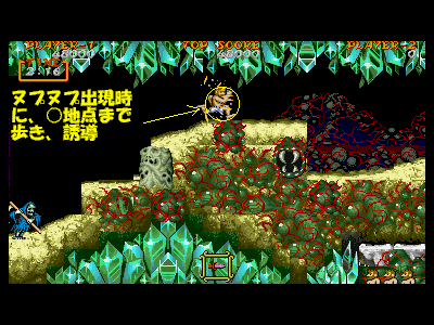 D地点:2つめのデスタワーとヌプヌプ まずは、デスタワーの下あたりから湧き出てくるヌプヌプを始末します。ヌプヌプを攻撃する前に、一度空ジャンプをして、デスタワーの弾を誘導しておくと、ヌプヌプに攻撃している時に、不意の弾でやられにくくなります。 ヌプヌプを倒したら、今度はデスタワーをジャンプ攻撃で倒します。横に突き出ているクリスタルの固まりは、当然攻撃判定を持っているので、逃げジャンプなどはしないようにして、戦いましょう。 |