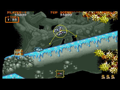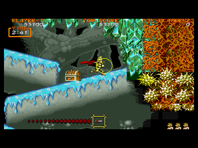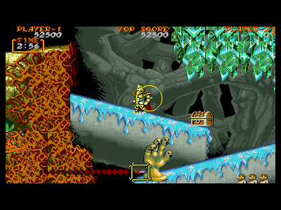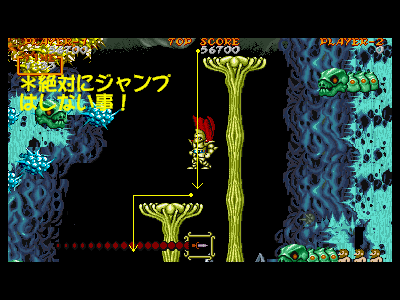 | A地点:1つめの宝箱 後半エリアに入った直後、フィールドを歩いていたら、勝手に出現します。当然、1つ目の宝箱なので、中身はマジシャンなのですが、すぐ上の部分がクリスタルになっていますので、ジャンプして抜けるのは大変危険です。軽く破壊し、マジシャンを倒した後、下段にいるデビルハンドを下撃ちで倒し、先に進みましょう。 また、もしマジシャンの攻撃を喰らったとしても、この段には敵が出現しないので、左側にジャンプを連発し、回復するのを待ちましょう。 |