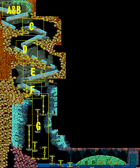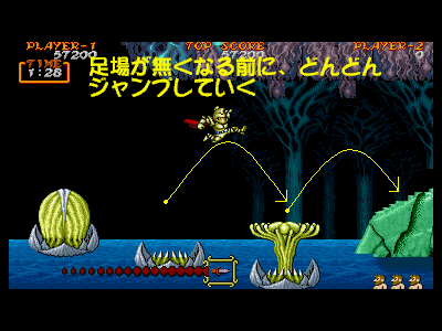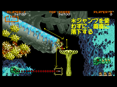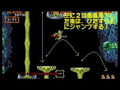 | G地点:大毒花地帯 前半の流れる床地帯を抜けると、最後のボス前までは、リフト代わりになっている大毒花地帯になっています。この部分は、抜け方が分からない時は、訳も分からずにジャンプを連発し、足を踏み外して死んでしまうか、モタモタしている間に左右のダストモンスターの吐く弾に当たってダメージ>足を踏み外して死亡というパターンになりやすいのですが、実はやり方さえ分かってしまえば、とても簡単に突破できます。 まず、右図1番めのように、流れる床地帯から抜ける際に、ジャンプせずに、垂直落下して最初の大毒花に乗ります。その後は、左側にレバーを入れ、また垂直に落下します(右図1〜2番目)。その次の大毒花に着地した後も、レバーを左に入れ、再度左側に落下します(右図2〜3番目)。 そのようにして、下方まで落下した後は、ひたすら右方向に向かってリズミカルにジャンプを繰り返し、ボスキャラであるオームへと向かいます(右図4〜6番目)。注意するべき点は、ここまでの行動を素早くリズミカルに行わなければいけないということです。なぜなら、大毒花の収縮する速度は意外と早く、もたもたしていると、あっという間に足場を失ってしまうからです。垂直落下するエリアでも、ゆっくり行動していると画面上にダストモンスターの吐く弾がばらまかれ、避けるのが非常に困難になります。 このエリアまで到達すれば、もうボスは目の前ですので、焦らずミスのないプレイを目指して下さい。 |