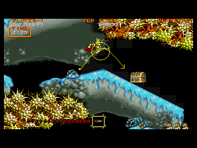 D地点:4つめの宝箱 左図のどちらの丸の部分を通過しても出現します。また、出現場所は左図の通り一定で、右側に飛んだ場合、宝箱の中身を取ることができなくなります(再度上にのぼることが不可能なため)。 ここまででダメージを受けていて、今までの全ての宝箱を出現させていたら、鎧が出現する、大変大事な宝箱ですが、できれば、2個めを無視しておきたいものです。 |