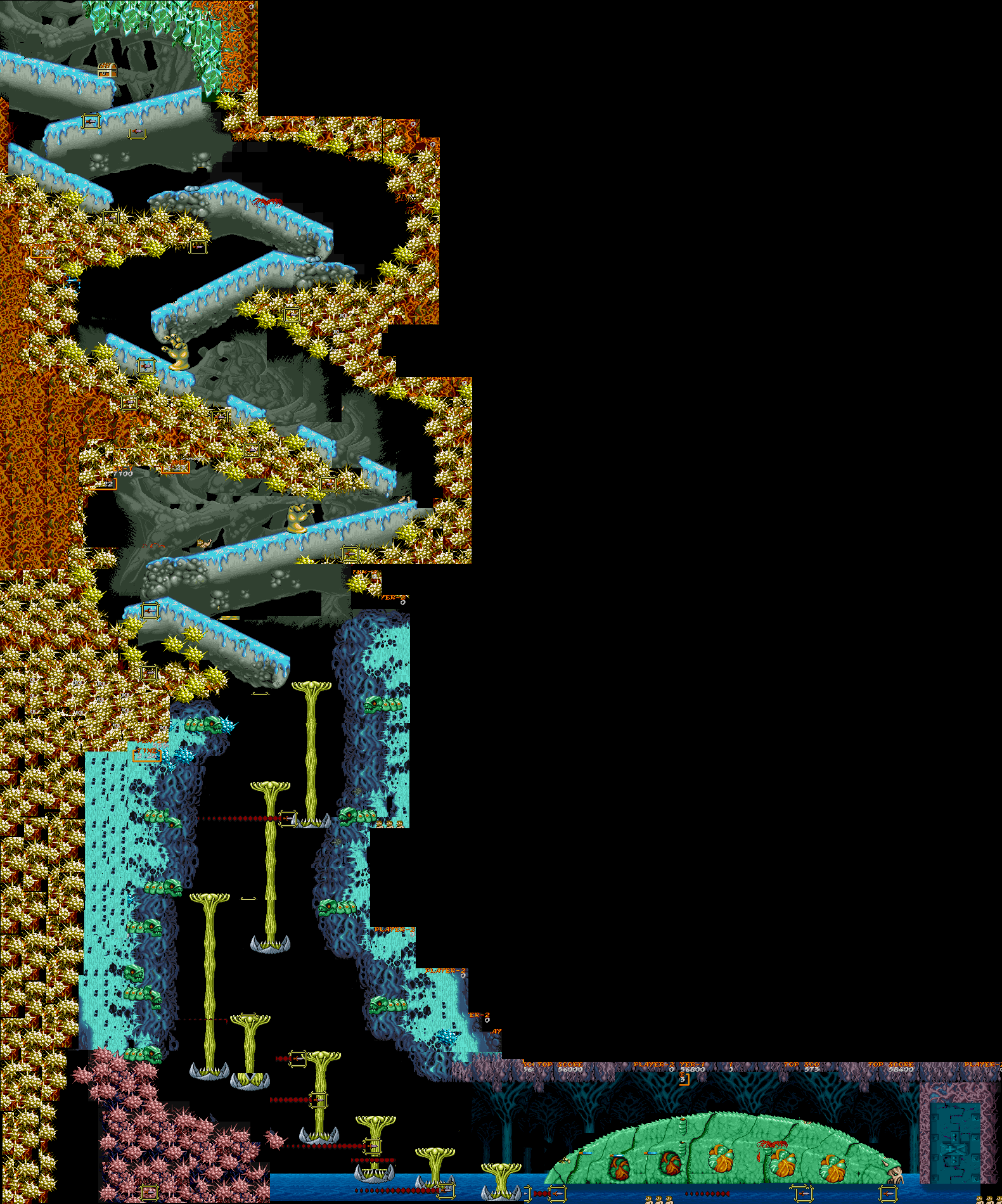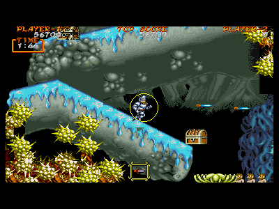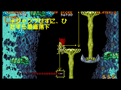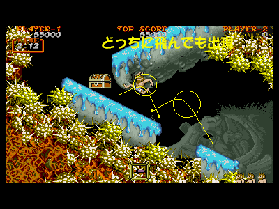 B地点:2つめの宝箱 こちらも歩いているだけで簡単に出現します。が、公開しておいて、こういうのも何ですが、この宝箱は、基本的に出現しないように進むのがベストです。 理由は簡単で、宝箱の個数合わせの為です。4面後半エリアは、全部で6つの宝箱が出現するのですが、ちょうど4、5個めの間の地点の地形と敵配置がいやらしく、そこでダメージを喰らう可能性が高いからです。さらにその地点でダメージを受けた場合、4個めの宝箱の地点まで戻るのは不可能なため、復活するのが、とても難しくなります。個数調整がもっともしやすい(無視できる)宝箱が、この2個めだけなので、この宝箱を無視するのが、最も安全であると思われます。 |